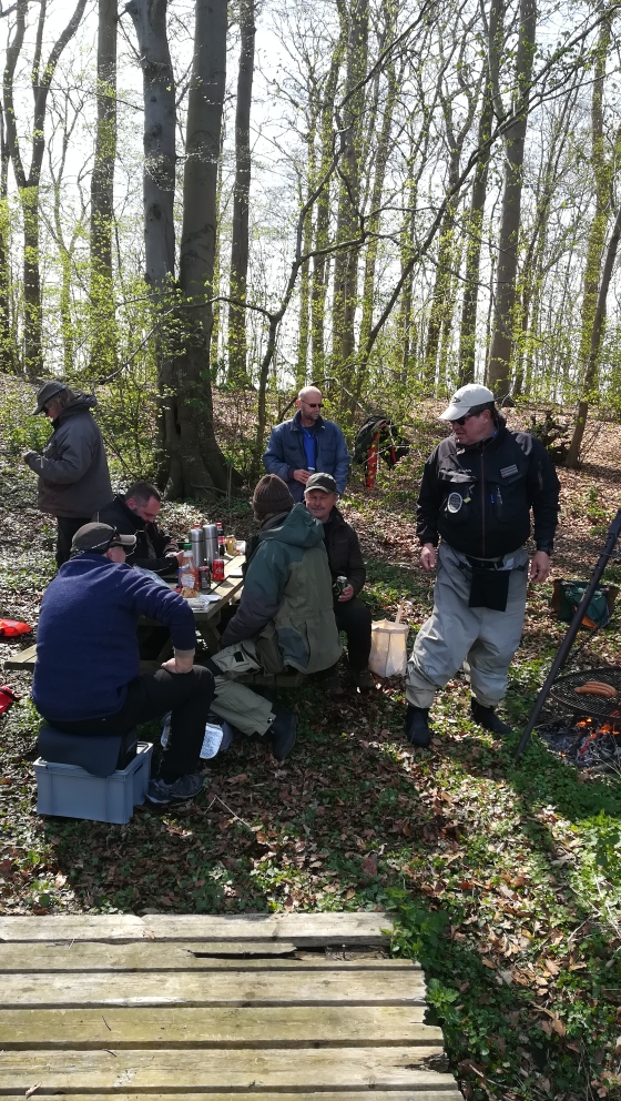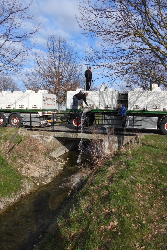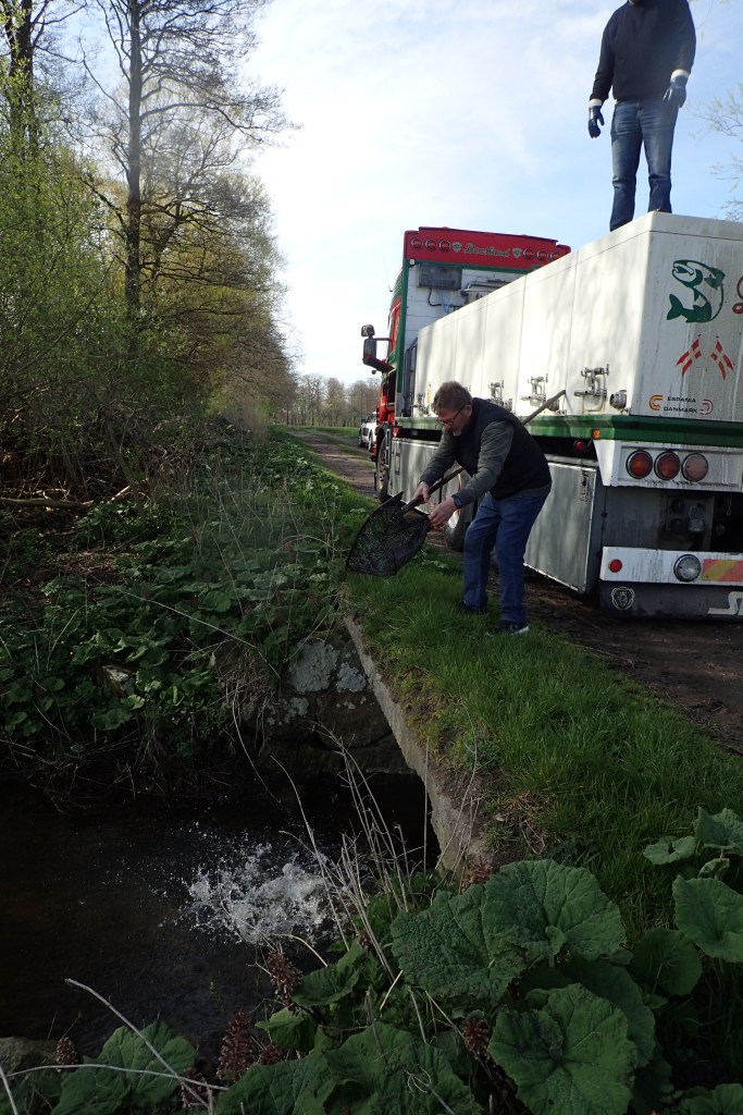Den 15. april kom Flemming fra Vork Dambrug med den årlige portion fisk, der skulle udsættes i vore vandløb. Efter et smut til Møn kunne vi sætte smolt ud i mundingerne ved Sørup Å, Gundslev Å, Fribrødre Å, Tunderupløbet, Tingsted Å, Marrebæk Kanal, Flintinge Å, Sakskøbing Å og Hunså, i alt godt 43.000 fisk. Det har en størrelse (ca. 20 cm), der gør, at de trækker ud i havet og bliver blanke, og de skulle gerne nå mindstemålet på 40 cm senest næste forår.